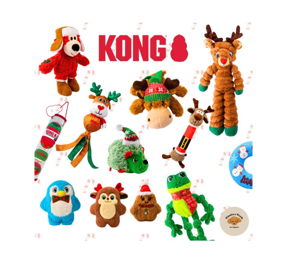 Kong Holiday Wubba Flatz são brinquedos de espírito natalício, ótimos para brincadeiras interativas e individuais, dentro e fora de casa.