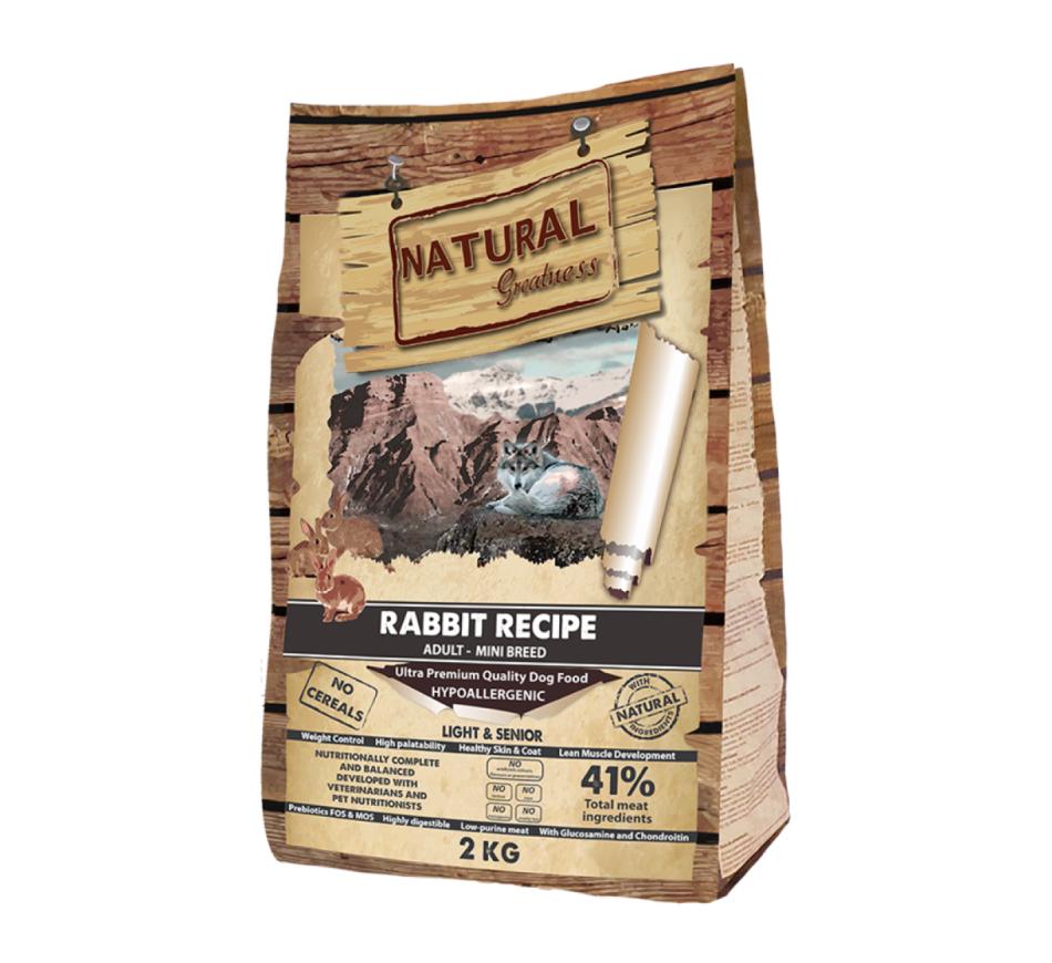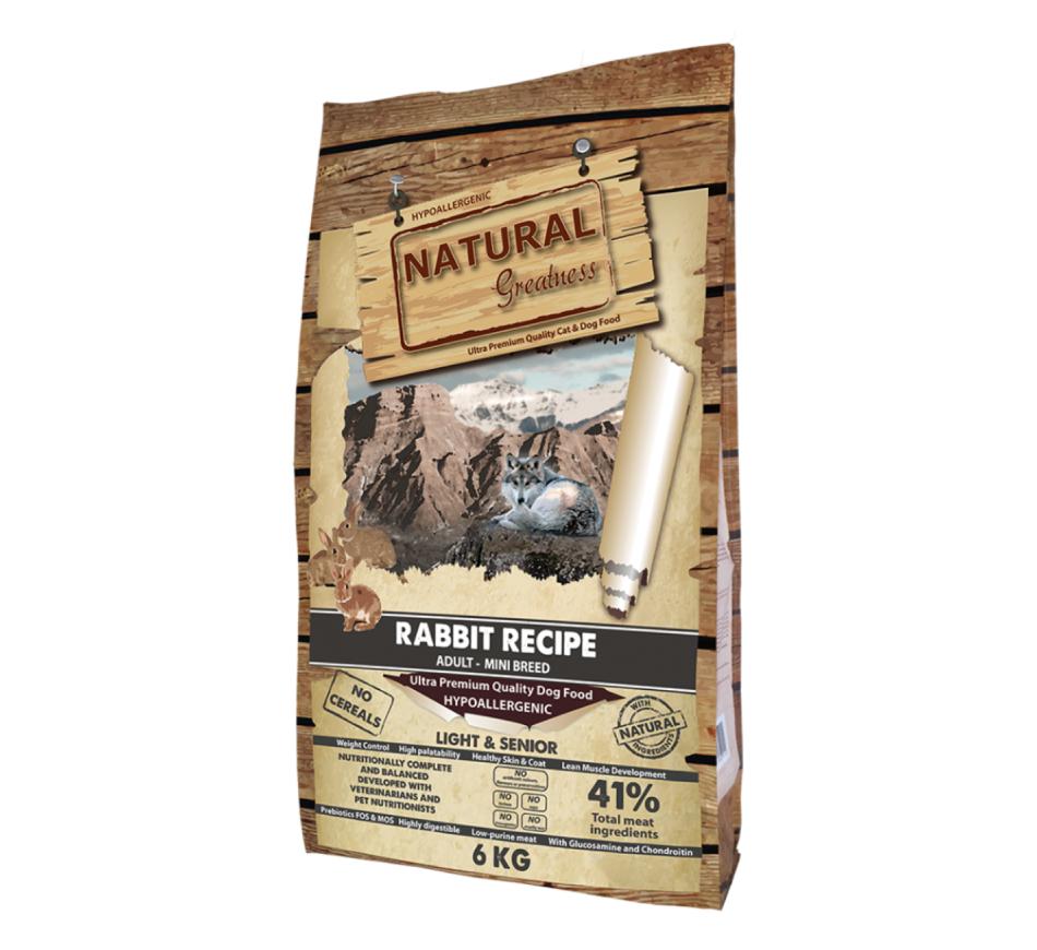 Natural Greatness Cão Light Fit & Senior Mini - Coelho é uma excelente receita ultra premium, monoproteica e hipoalergénica formulada sem cereais e desenvolvida idealmente para cães adultos, cães adultos esterilizados ou cães séniores de raças pequenas e médias com tendência a excesso de peso.