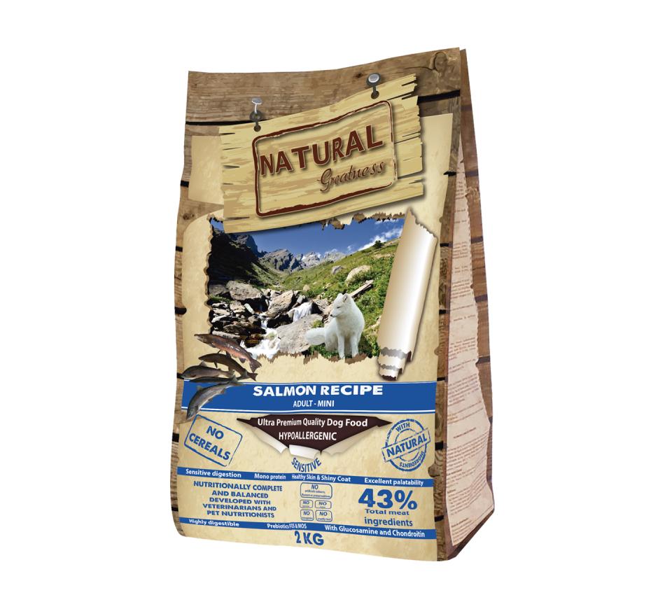 Natural Greatness Salmon Mini Sensitive é uma receita de salmão, hipoalergénico e monoproteico. Com um tamanho de croquete, pequeno, desenvolvido para atender às necessidades de cães de raças pequenas e mini. É também um alimento completo desenvolvido para cães adultos com digestão sensível ou para cães que simplesmente requerem alimentos de alta qualidade.