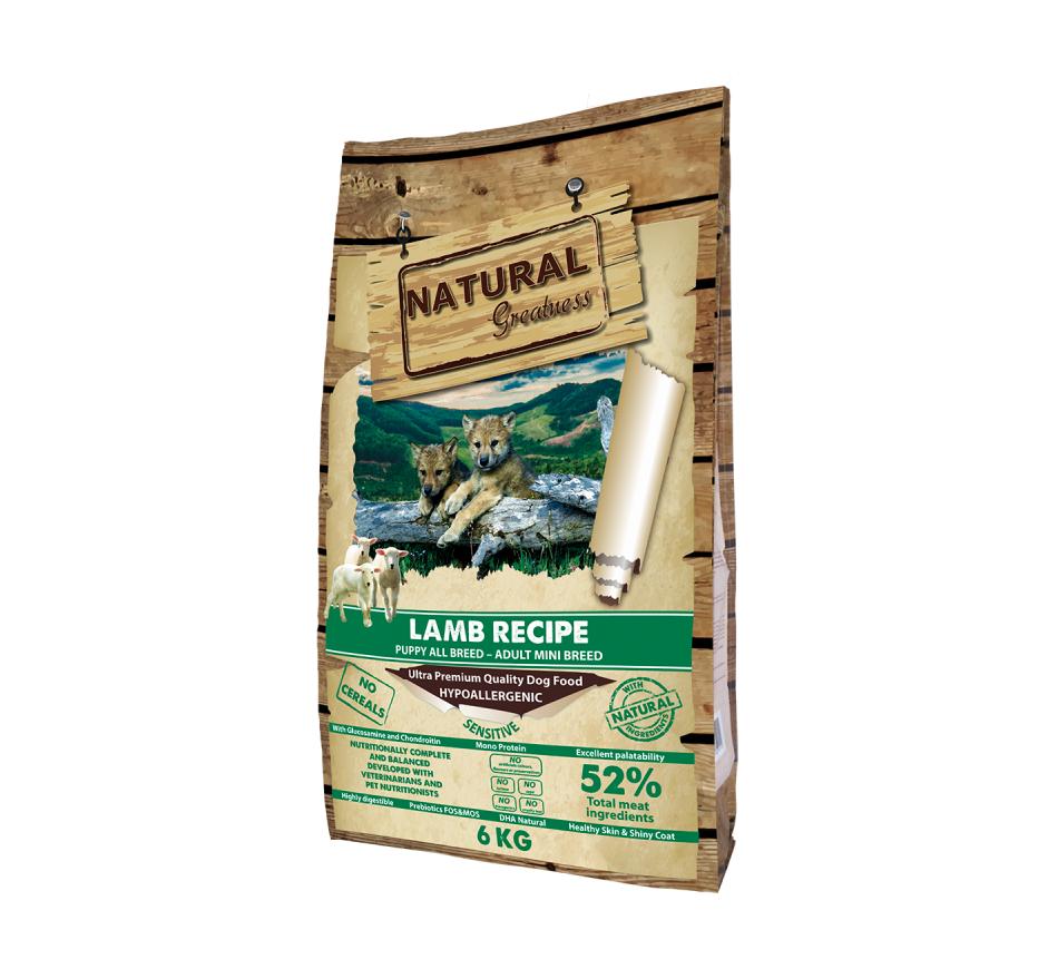 Natural Greatness Cão Puppy & Adult Mini Breeds Lamb é uma excelente receita ultra premium e hipoalergénica formulada sem cereais e idealmente desenvolvida para cães adultos com digestão sensível, cachorros, fêmeas grávidas ou lactantes de raças pequenas e médias, ou para aqueles que simplesmente necessitam de uma alimentação de alta qualidade.