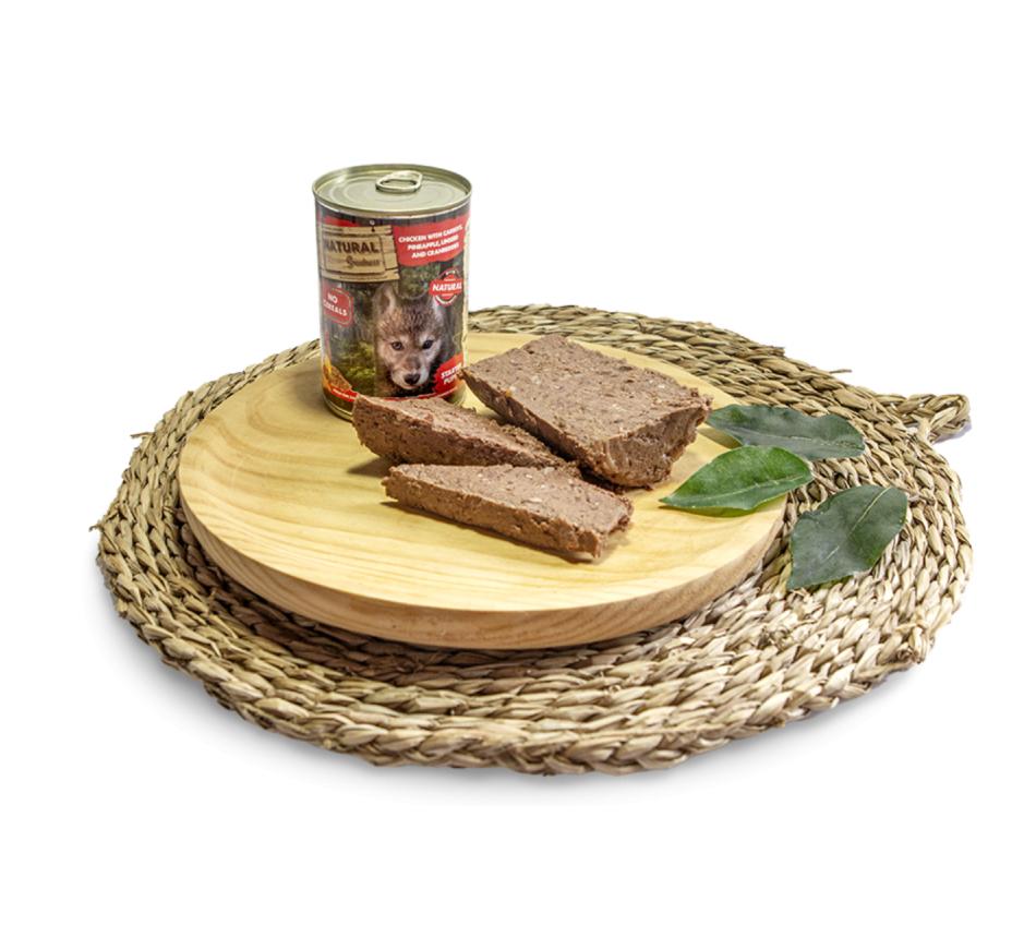 Ração húmida Ultra Premium indicado para cachorros a partir do desmame, com Frango triturado com pedaços de cenoura, abacaxi, sementes de linhaça e cranberries, sem cereais e sem conservantes e sabores artificiais.