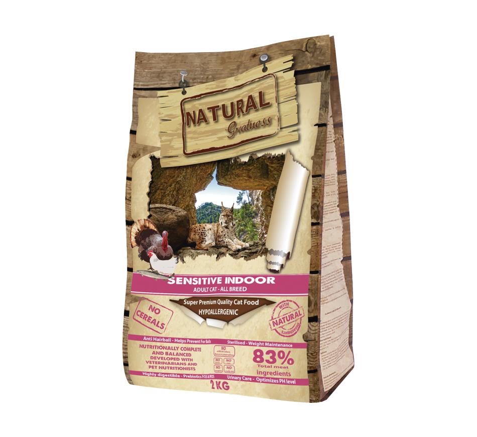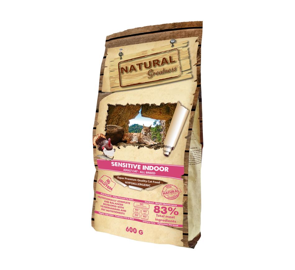 Natural greatness sensitive indoor - gato é uma ração hipoalergénica, com alta digestibilidade, especialmente indicada para gatos esterilizados, gatos com tendência para sobrepeso, gatos seniores e em geral, gatos adultos que vivem em interiores.