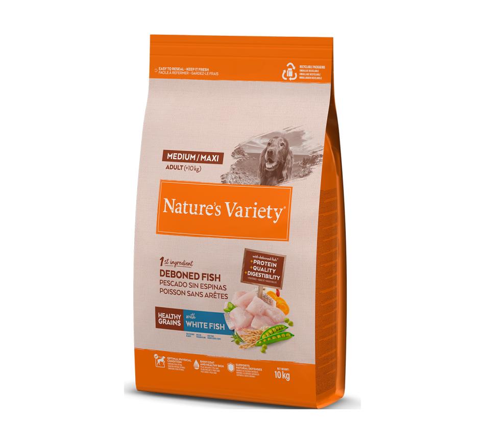 Nature's Variety Healthy Grain Cão Adulto Medium/Maxi - Peixe Branco é um Alimento seco completo e equilibrado para cães adultos de raça média e grande. Com sabor a peixe.