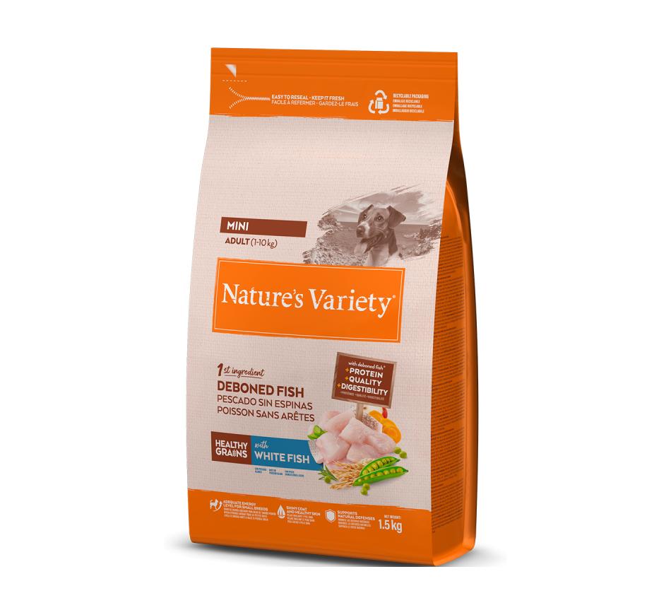 Nature's Variety Healthy Grain Cão Adulto Mini - Peixe Branco é um Alimento seco completo e equilibrado para cães adultos de raça pequena. Com sabor a peixe.