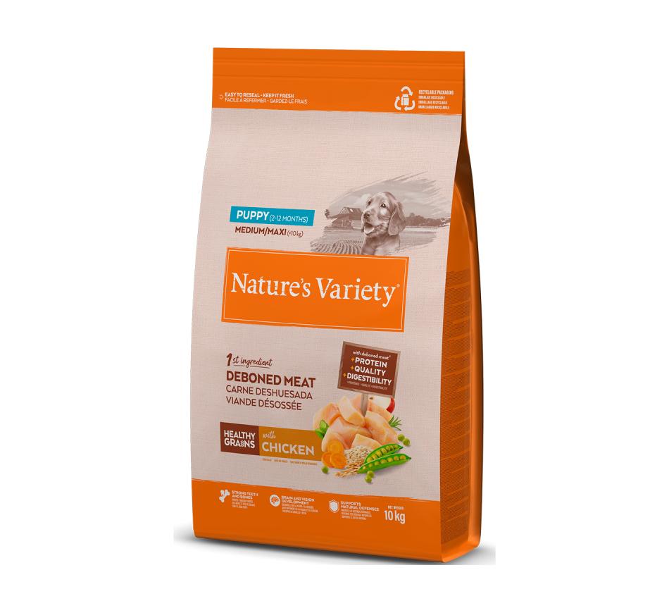 Nature's Variety Healthy Grain Cão Puppy Medium/Maxi - Frango é um Alimento seco completo e equilibrado para cachorros de raça média ou grande de 2 a 12 meses. Com sabor a frango.