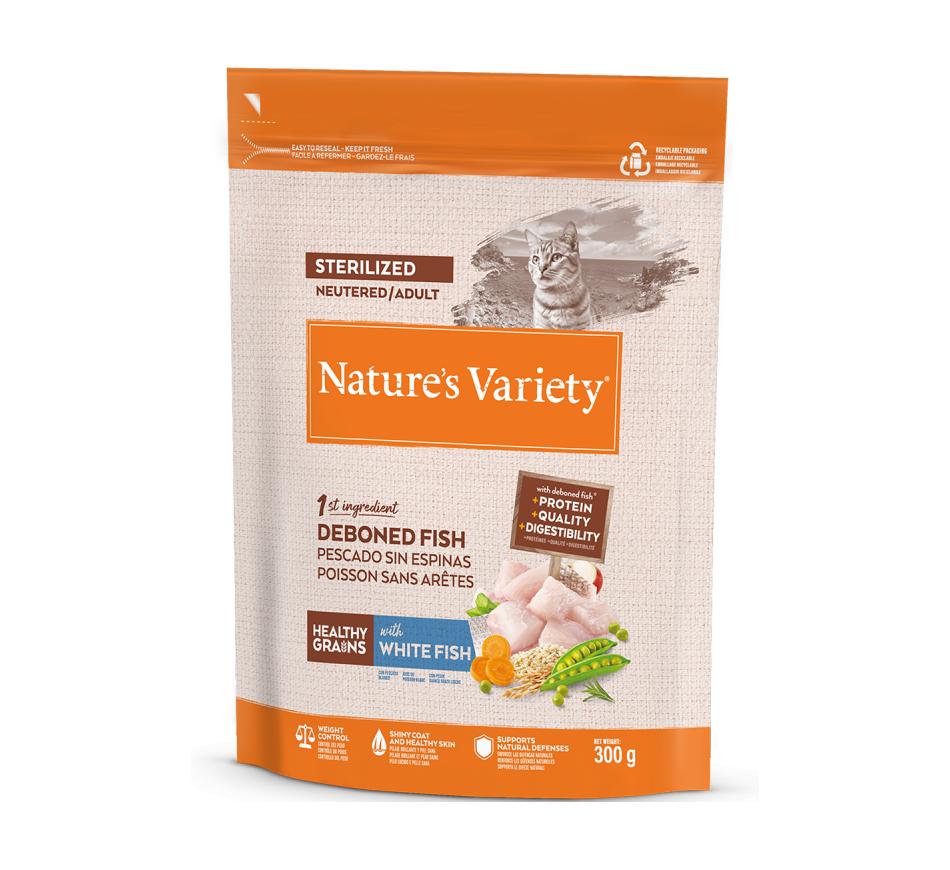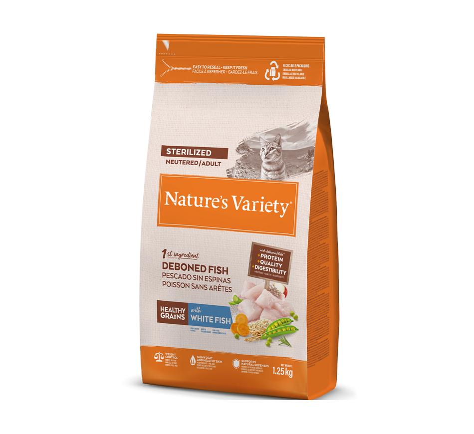 Nature's Variety Healthy Grain Gato Esterelizado - Peixe Branco é um Alimento completo e equilibrado para gatos adultos esterilizados ou com tendência a sobrepeso. Com sabor a peixe.