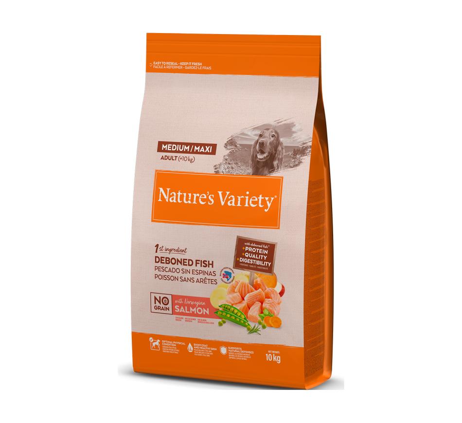 Nature's Variety No Grain Cão Adulto Medium/Maxi - Salmão da Noruega é um Alimento seco completo e equilibrado para cães adultos de raça média e grande. Com sabor a salmão e sem cereais.