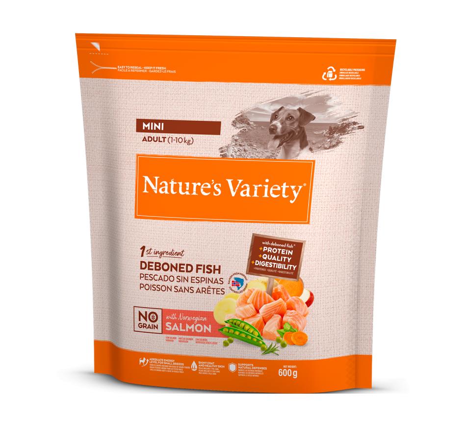 Nature's Variety No Grain Cão Adulto Mini - Salmão da Noruega é um Alimento seco completo e equilibrado para cães adultos de raça pequena. Com sabor a salmão e sem cereais.