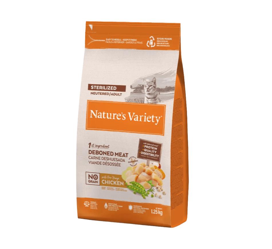 Alimento completo e equilibrado, em croquete, indicado para gatos adultos esterilizados, sem cereais. Elaborado com carne de frango criado ao ar livre desossada como ingrediente principal.