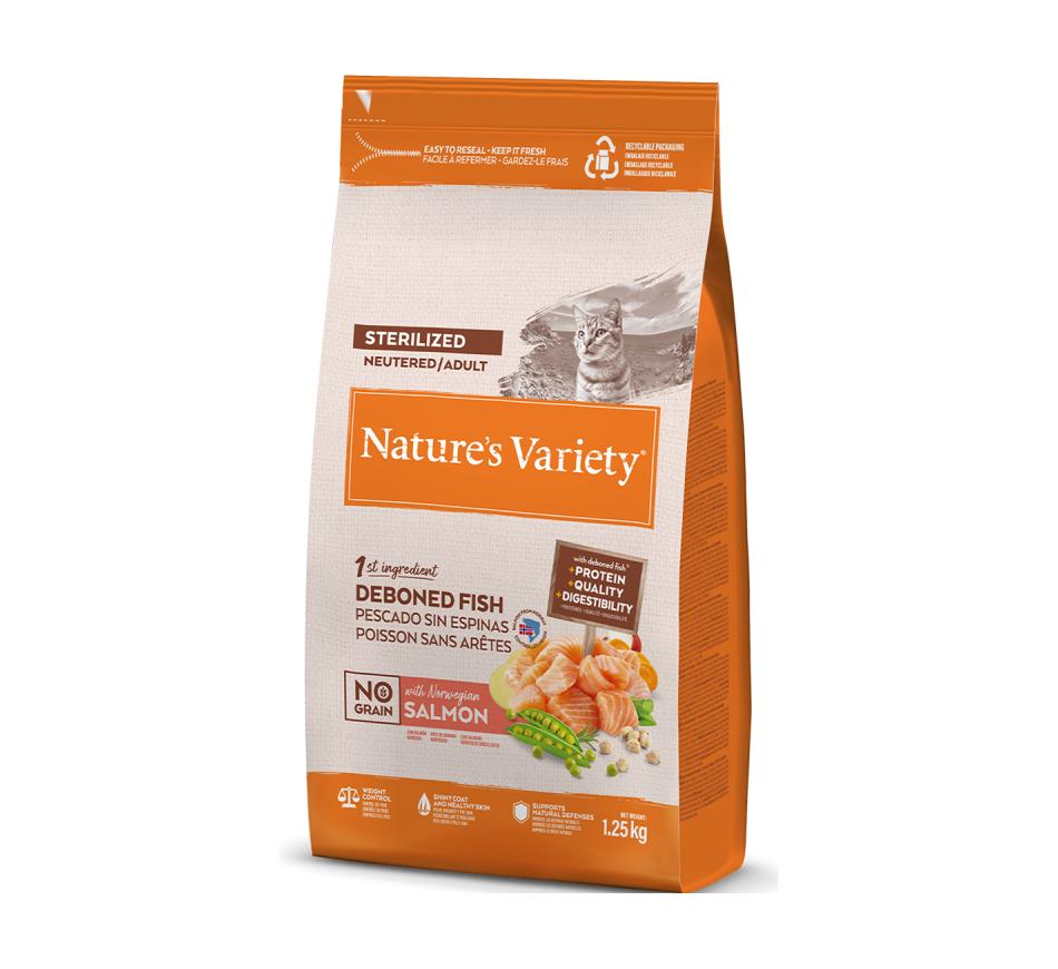Nature's Variety No Grain Gato Esterelizado - Salmão da Noruega é um Alimento completo e equilibrado para gatos adultos esterilizados ou com tendência a sobrepeso. Com sabor a salmão e sem cereais.