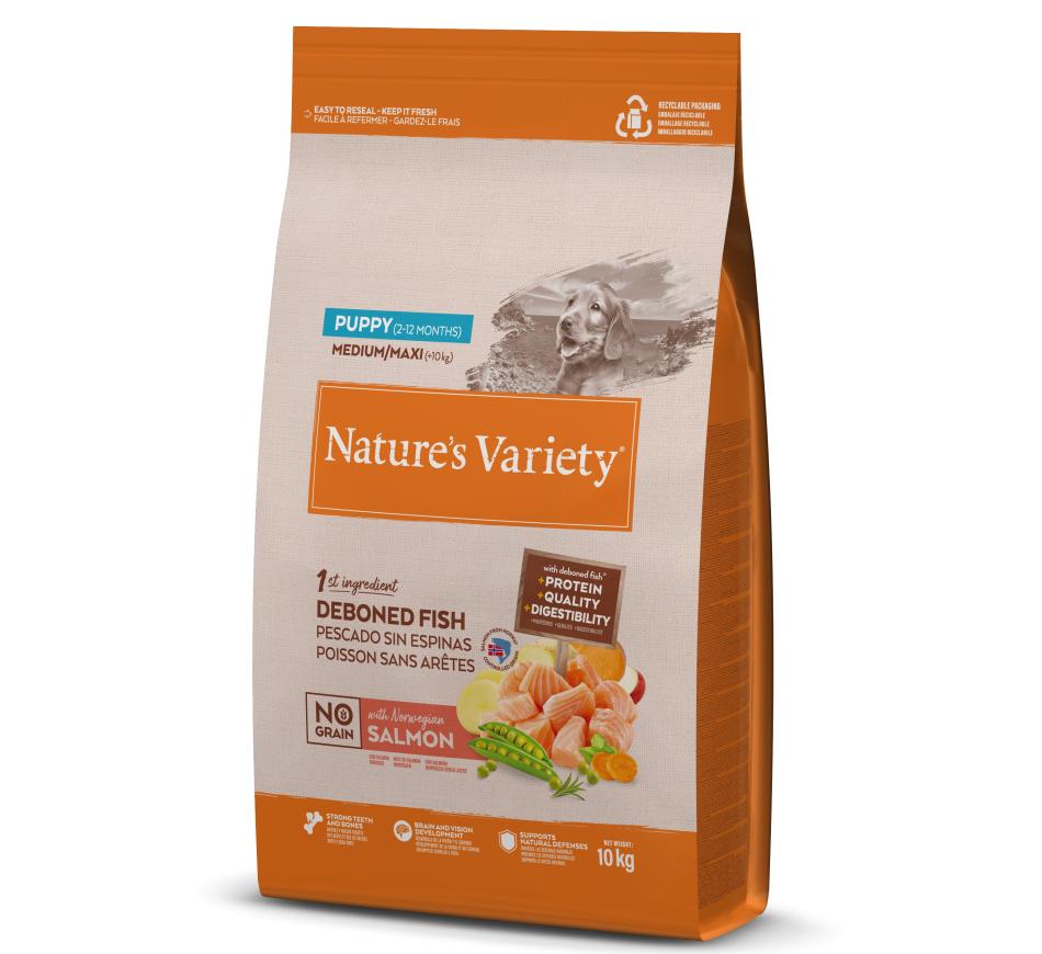 Nature's Variety No Grain Puppy Med/Maxi Salmão da Noruega é elaborado com salmão da noruega desossado como ingrediente principal. Combinado com frutas, legumes, superalimentos e fontes naturais de hidratos de carbono alternativos.