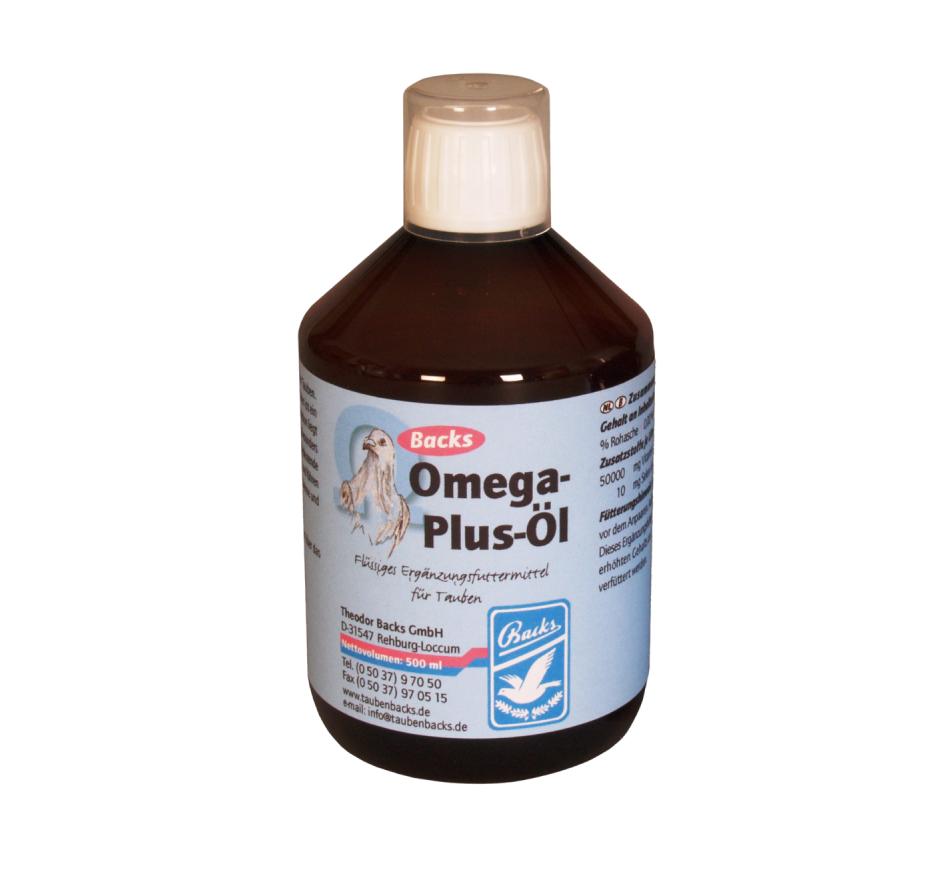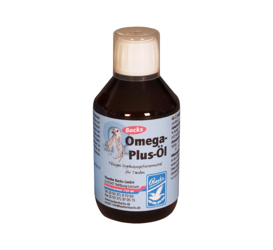 Óleo Omega Plus Backs foi desenvolvido de acordo com os mais recentes conhecimentos científicos no campo da nutrição de pombos. A combinação ideal de ácidos graxos ômega fornece imediatamente mais energia ao pombo. Além disso, o Óleo Ômega Plus fortalece o sistema imunológico e melhora a memória do pombo. A adição de lecitina também garante a absorção, armazenamento e transporte de ácidos graxos no corpo.