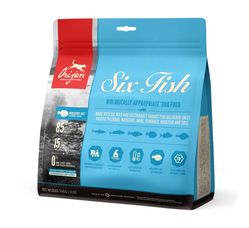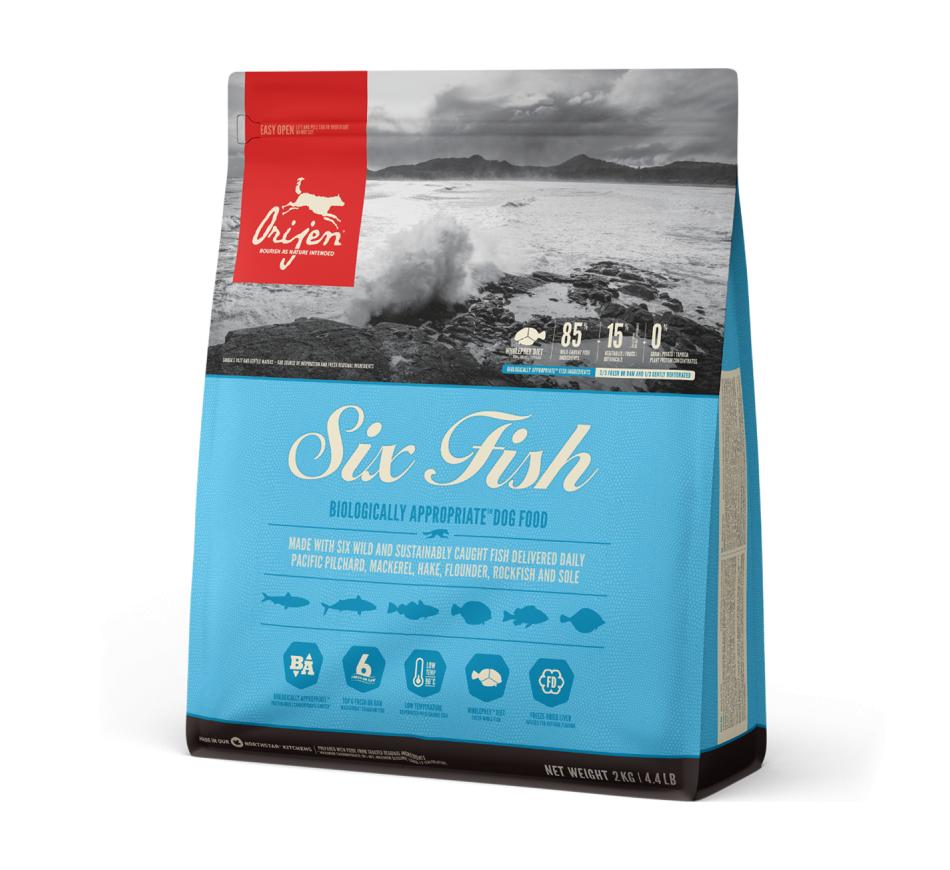 Por este motivo, o alimento Biologicamente Adequado orijen 6 fish apresenta incomparáveis inclusões de peixe inteiro de água salgada e de água doce, de captura selvagem, todos pescados na nossa região e entregues frescos diariamente, assegurando saúde e nutrição completa do seu cão.
