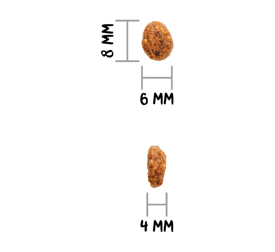 Alimento em croquete, sem cereais, composta por, frango, 60% de carne fresca, e 40% de frutas, vegetais e superalimentos, estado indicado para gato esterilizados.