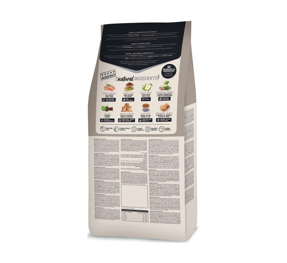 Ownat Classic Light é uma ração elaborada com 35% de carne, 10% carne frango fresco, arroz integral, ervilhas, maçãs e outros ingredientes de qualidade. Também incorpora óleo de salmão para o cuidado da pele e do pelo e levedura de cerveja para proteger o sistema imunológico.