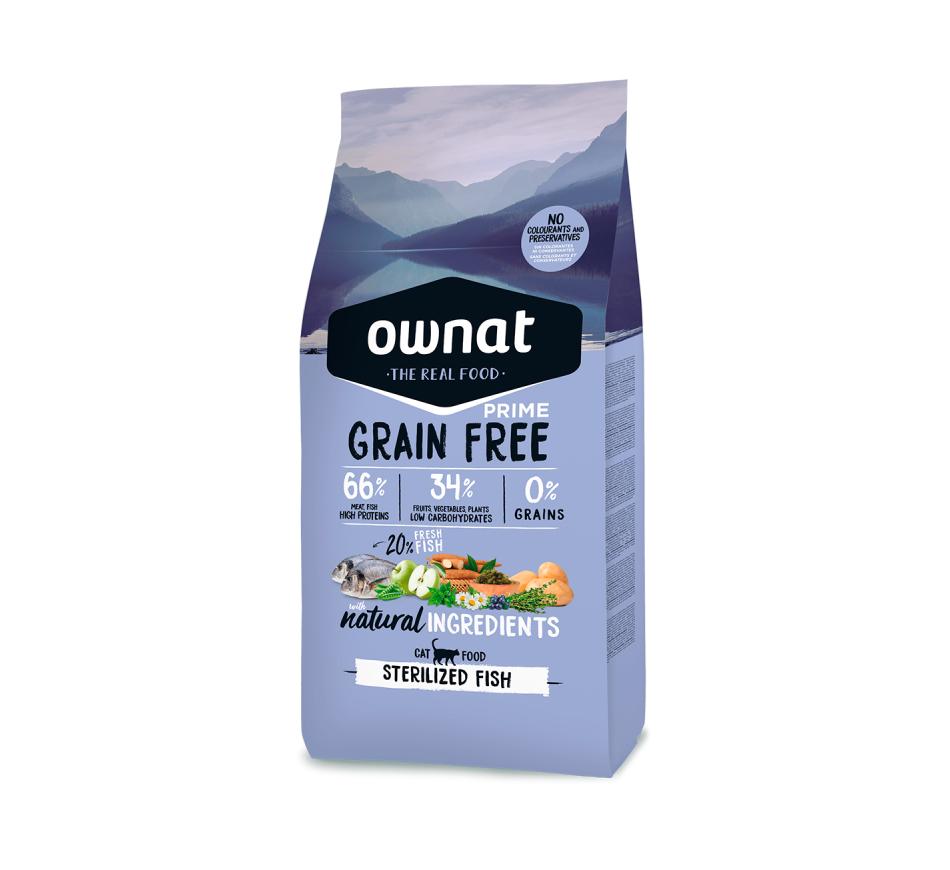 Ownat Grain Free Prime Gato Sterilised incorpora óleo de peixe, rico em ácidos gordos ómega 3 e ómega 6 para uma pele e um pelo saudáveis, contém glucosamina e a condroitina, componentes que promovem a saúde articular, essencial durante o crescimento.