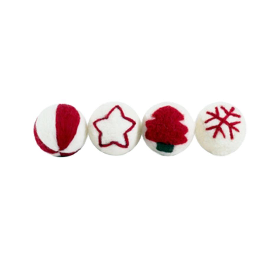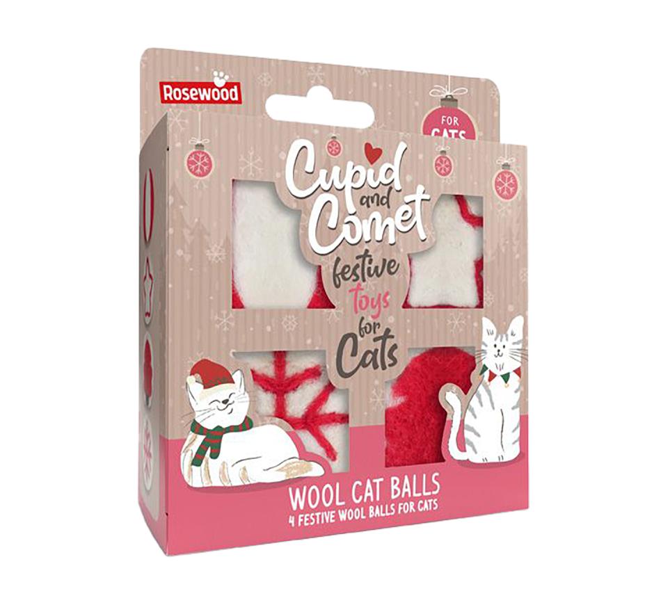 Pack 4 Wool Cat Balls - Rosewood é um brinquedo fofo e ternurento, com cores vibrantes, texturas agradáveis e com detalhes encantadores, irá deliciar o seu pet nesta época natalícia.
