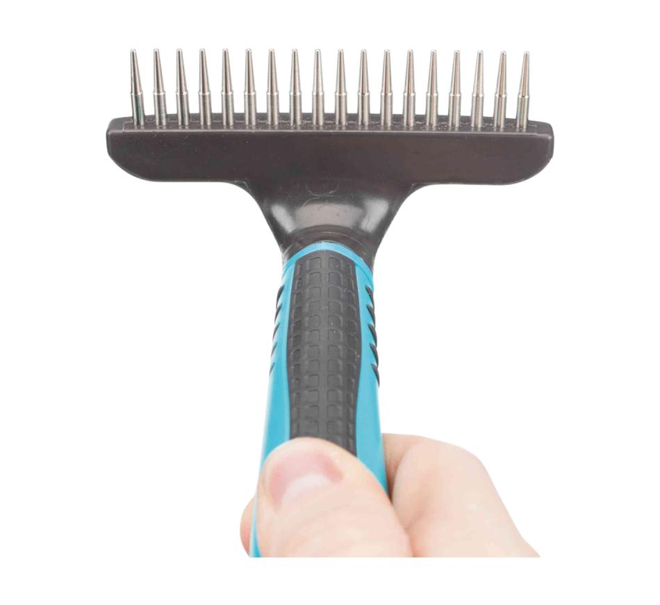 Pente Ancinho com uma camada de dentes 2cm, estando especialmente indicado para cães de pelo médio e longo, com uma pega de plástico com borracha para um pega confortável.