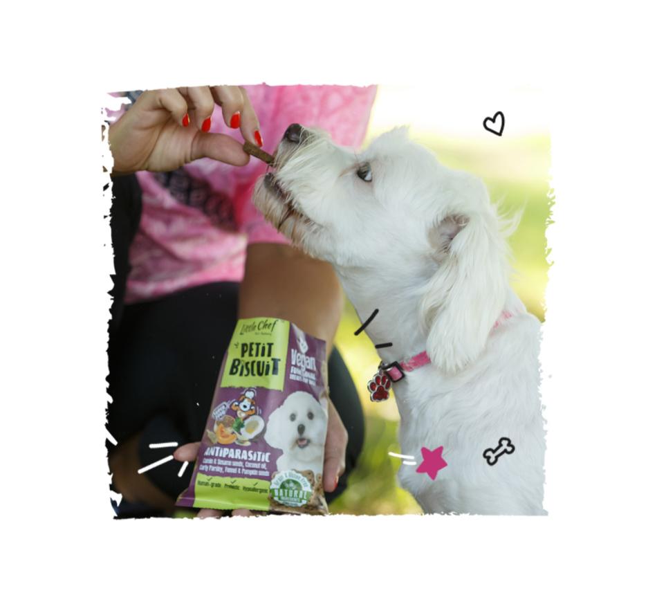 Petit Biscuit Antiparasitic é um suporte proativo para o seu cão contra parasitas externos e internos . Petiscos funcionais, saudáveis e deliciosos para cães. Estes petiscos são cozidos no forno em pequenas quantidades com ingredientes superalimentos, naturais e de qualidade apto para o consumo humano, e são veganos. Podem ser oferecidos aos cães em qualquer ocasião como recompensa ou petisco.