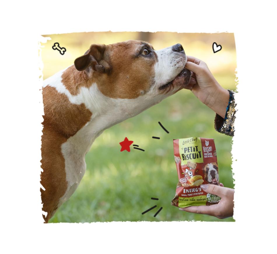 Petit Biscuit Energy é um suplemento proativo que fornece energia, aumenta a imunidade e melhora a aparência da pele e dos pelos ao longo do tempo . Petiscos funcionais, saudáveis e deliciosos para cães. Esses petiscos são cozidos no forno em pequenas quantidades com ingredientes superalimentos, naturais e de qualidade apto para o consumo humano, e são veganos. Podem ser oferecidos aos cães em qualquer ocasião como recompensa ou petisco.