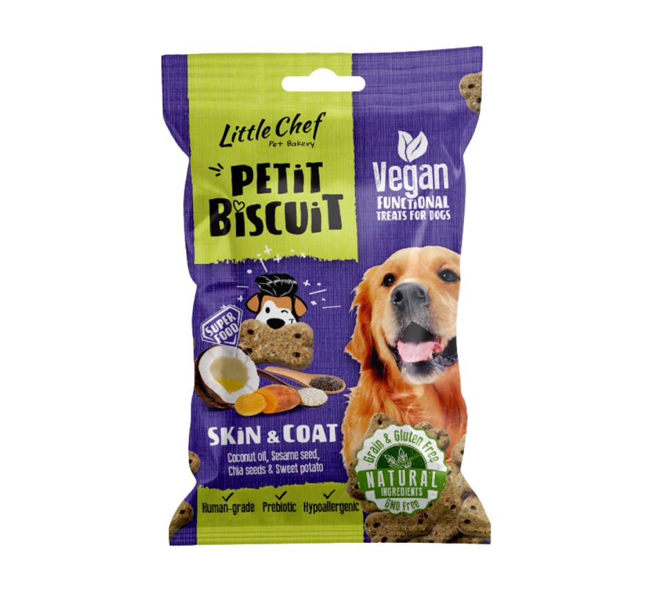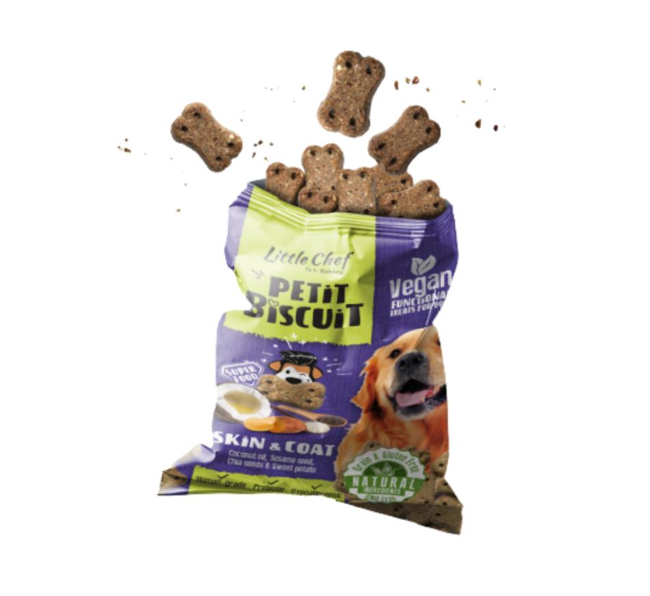 Petit Biscuit Skin & Coat é um suporte proativo para a saúde dos pelos e uma pele melhor do seu pet . Petiscos funcionais, saudáveis e deliciosos para cães. Esses petiscos são cozidos no forno em pequenas quantidades com ingredientes superalimentos, naturais e de qualidade apto para o consumo humano, e são veganos. Podem ser oferecidos aos cães em qualquer ocasião como recompensa ou petisco.