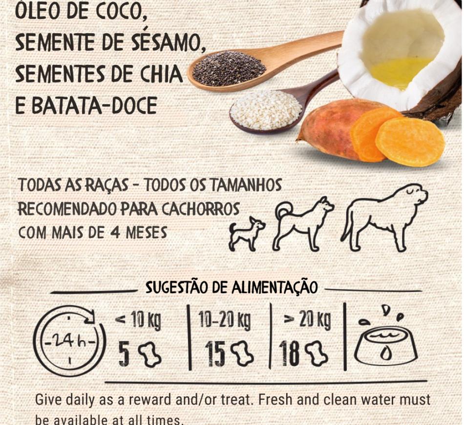 Snack treat funcional, com reforço proativo na pele e no pelo do seu cão, deliciosos e saudáveis. Com super-alimentos, sem cereais e cozidos no forno.