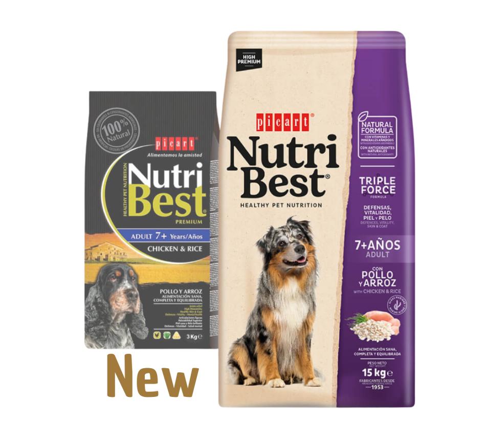Nutribest Adult 7+ Anos com frango e arroz é um alimento High Premium formulado pelos nossos especialistas em nutrição e veterinários para ajudar o seu cão a crescer saudável e vital e a desfrutar de uma saúde óptima. Contém algas marinhas do Atlântico Norte para uma pele e um pelo saudáveis e bem tratados.