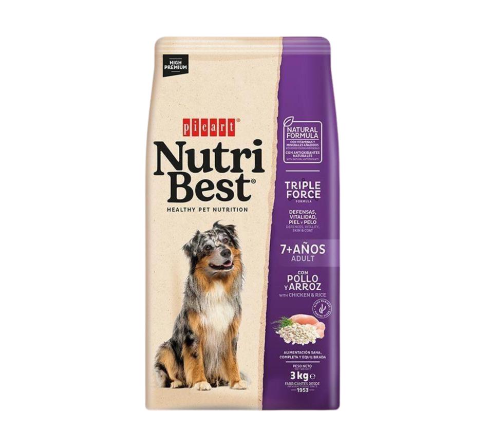 Alimento completo e equilibrado, ração seca com frango e arroz, indicado para cães adultos com +7 anos de idade, com triple force.