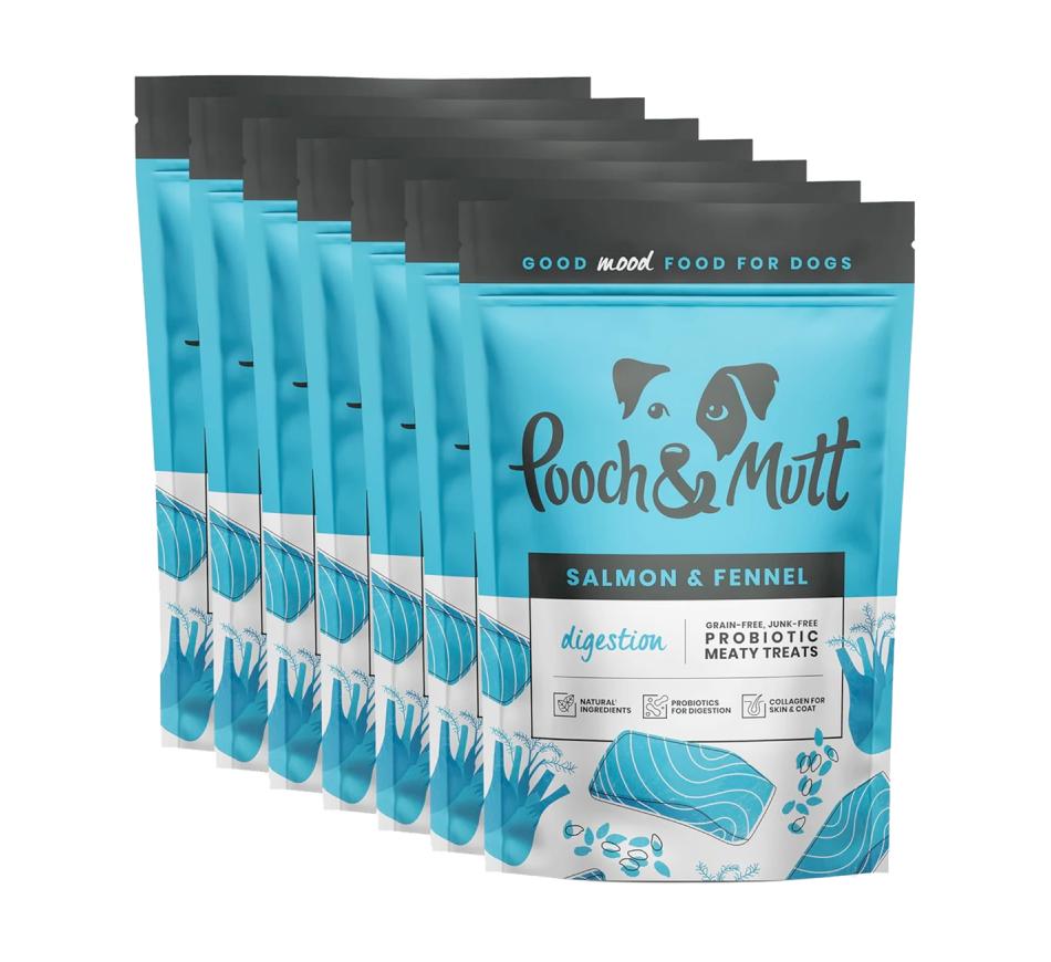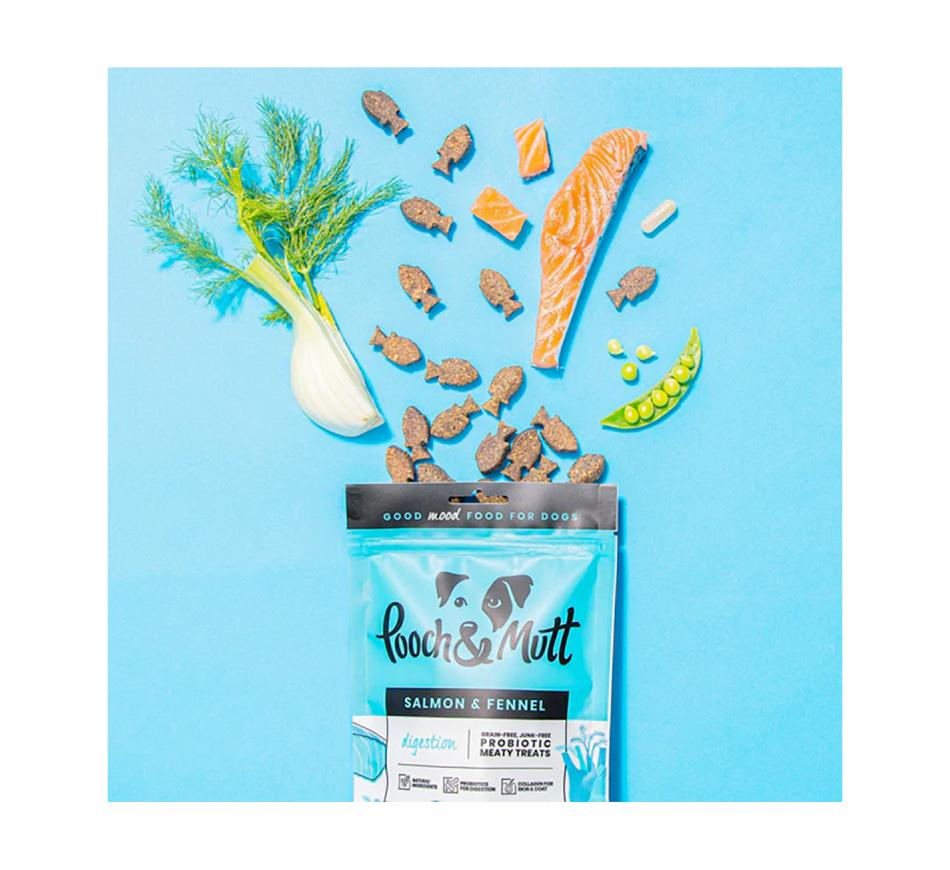 Pooch & Mutt Snacks Funcionais Health & Digestion são Snacks proteicos grain free que ao combinar super ingredientes funcionais auxiliam na digestão e bem estar nomeadamente o funcho, ácido fúlvico e algas marinhas sendo ainda enriquecidos com pre e probióticos.