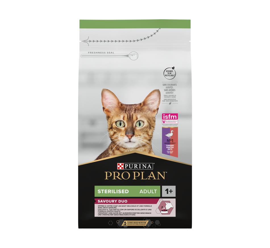 Purina PRO PLAN Sterilised com OPTISAVOUR é um alimento seco completo, rico em pato com fígado, para gatos adultos esterilizados.