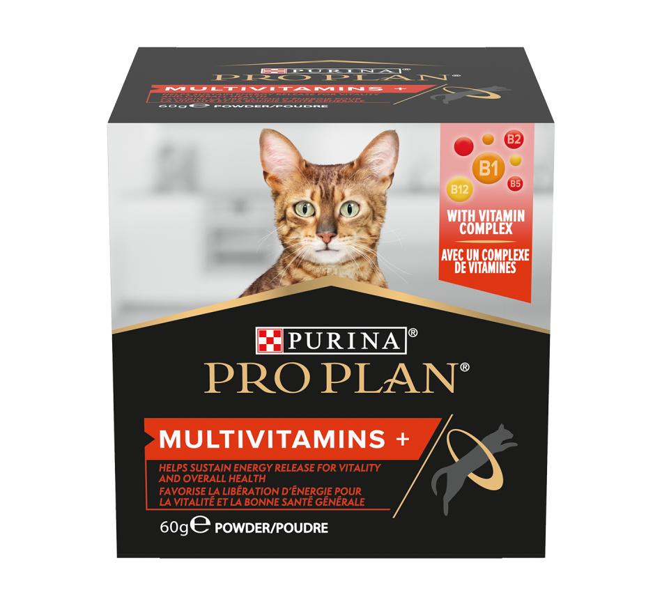 Pro Plan Multivitamins + ajuda a manter o seu gato cheio de vitalidade porque contém um complexo vitamínico (B1, B2, B3, B5, B6, B12) e está cientificamente formulado para: