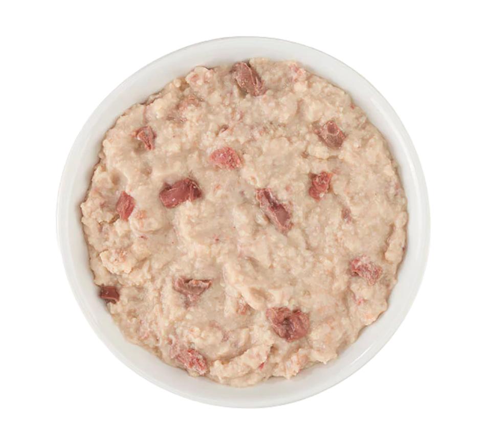 Patê moído rico em proteínas, feito com frango acompanhado de saborosos e nutritivos pedaços de coração, fígado e moela, com delicioso pato.
