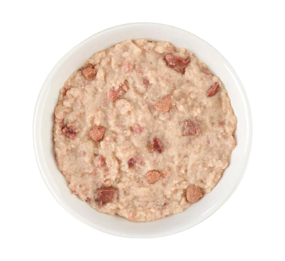 Patê moído rico em proteínas, feito com frango acompanhado de saborosos e nutritivos pedaços de coração, fígado e moela, com saborosa carne bovina.