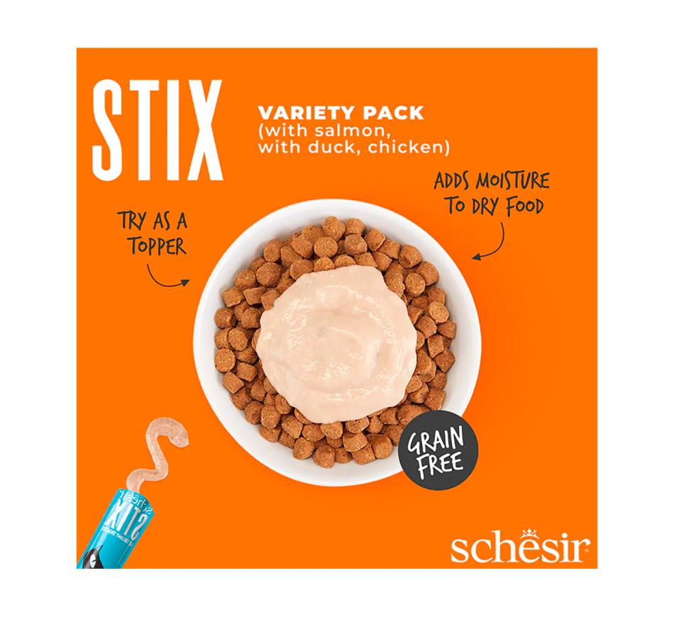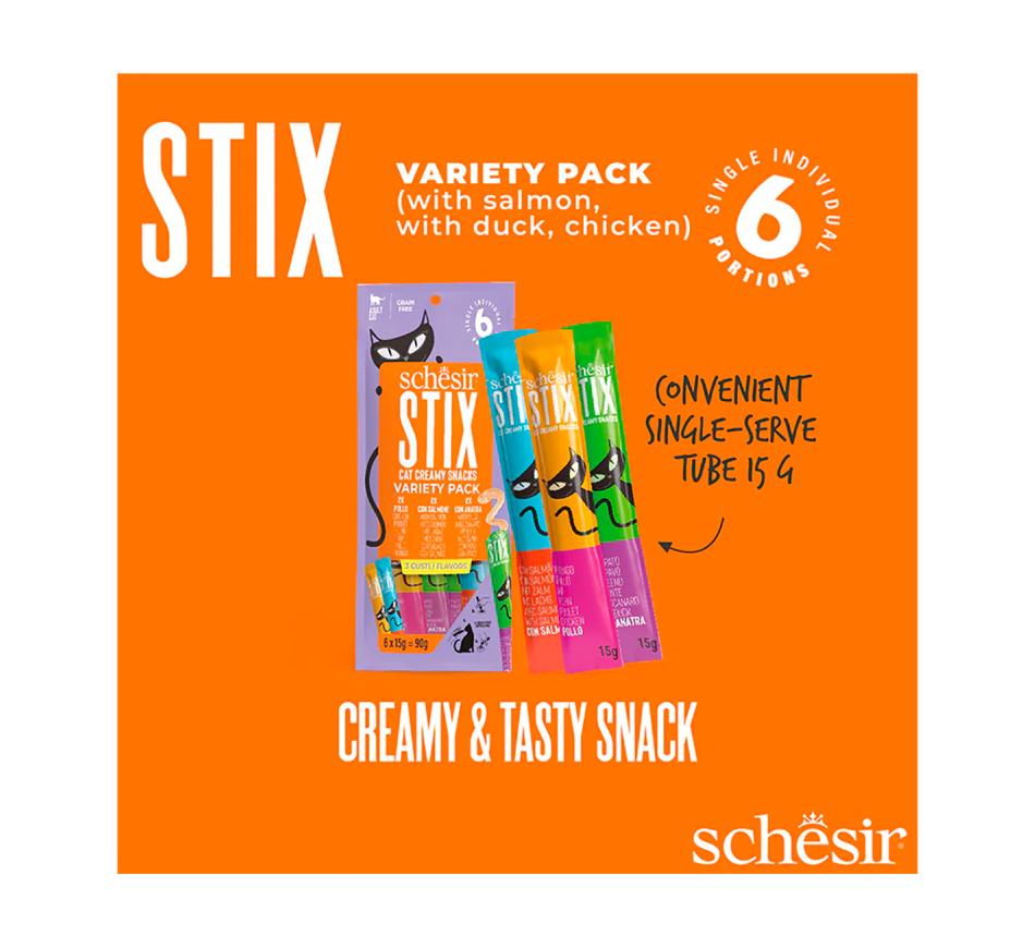 Embalagem multi-sabor. Snack complementar rico em proteínas provenientes da verdadeira carne de frango, pato ou peixe, em mousse cremosa (6 saquetas de 15g).