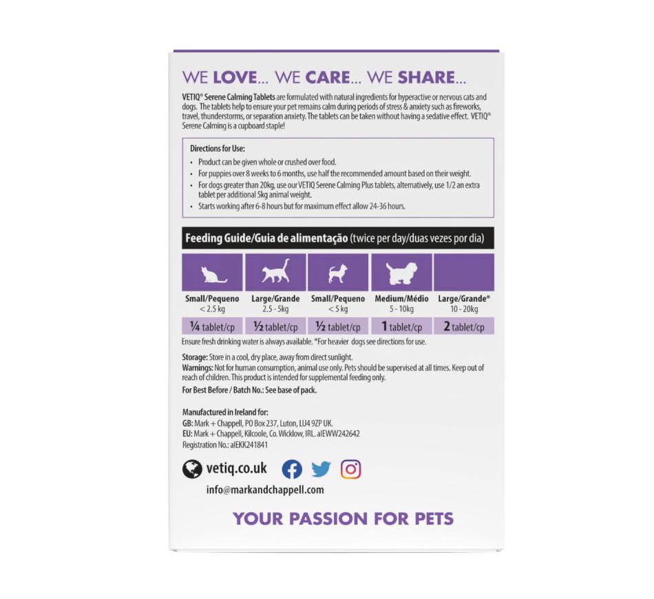 Vetiq Serene-UM é formulado com ingredientes naturais para cães e gatos hiperativos e nervosos. É recomendado por veterinários para garantir que o seu animal se acalma em períodos de stress e ansiedade, sem que tenha um efeito sedativo.
