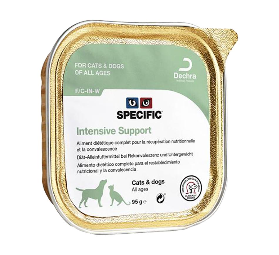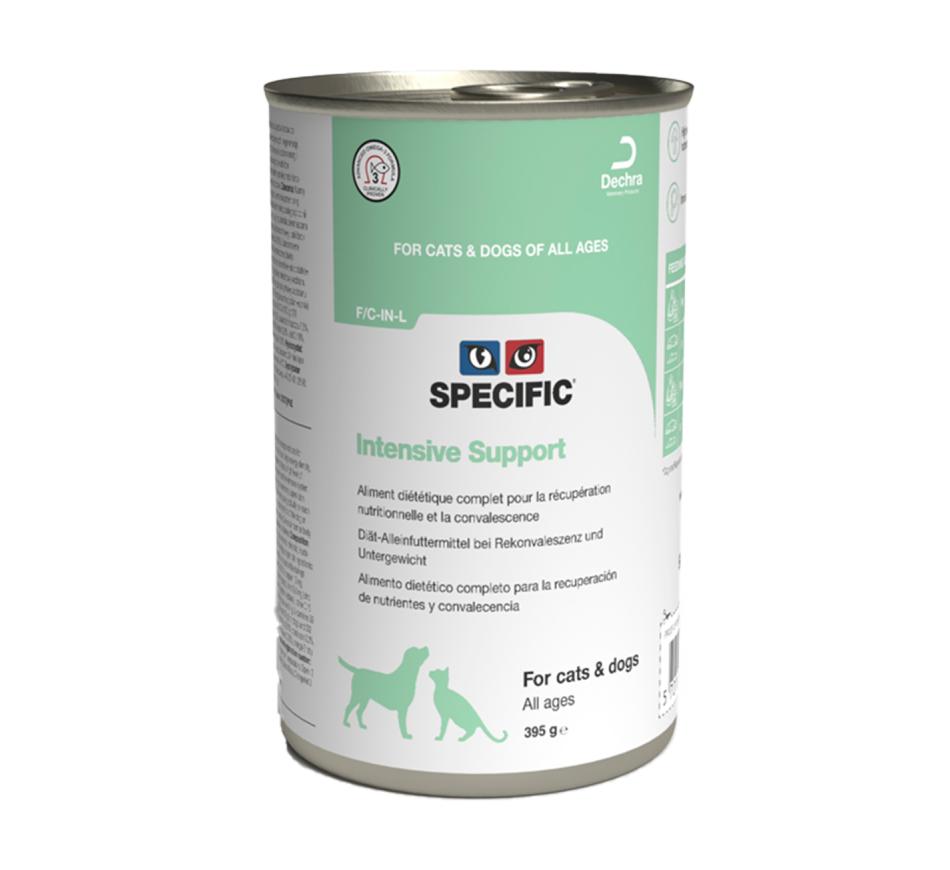 Specific F/C-IN-W (95gr) e Specific F/C-IN-L(395g) Intensive Support é indicado para cães e gatos adultos durante períodos de convalescença e recuperação.
