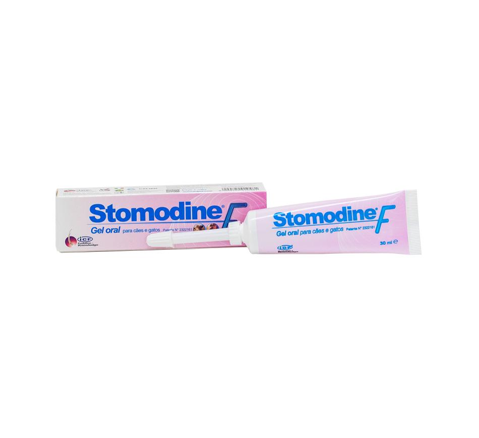 Stomodine F é um gel para gengivas e cavidade oral de gatos e cães, contendo óleo de cártamo e clorexidina com Tris-EDTA.