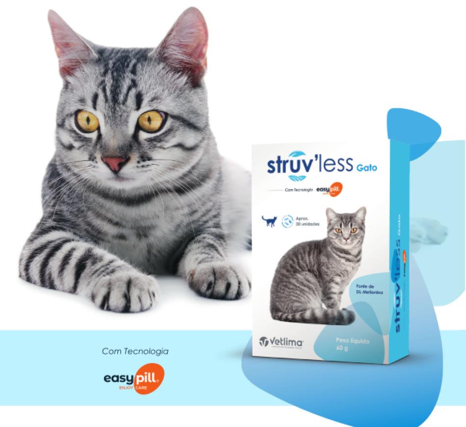 Struv'less Gato é uma opção para apoiar gatos com cálculos de estruvite no trato urinário inferior, ajudando a dissolver fragmentos residuais após uma terapia e prevenindo o reaparecimento dos cálculos. Podendo também ser utilizado para monitorizar e acidificar a urina do gato quando uma dieta terapêutica não é possível.