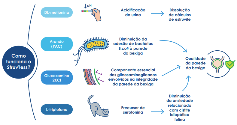 Struv'less Gato é formulado com DL-metionina para acidificar a urina e ajudar a dissolver os cálculos de estruvite. Também contém extratos de arando (fonte de proantocianidinas), glucosamina e L-triptofano, que contribuem sinergicamente para promover a integridade da parede da bexiga.