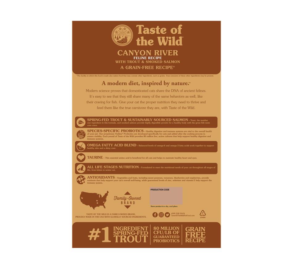 Taste of the Wild Canyon River Feline é um alimento completo de alta qualidade com um gosto requintado para alimentação diária de Gatos de qualquer idade e raça, sem cereais com truta e salmão fumado, batata doce, fruta e legumes. Rica em proteínas e muito saborosa, adequada para gatos de todas as raças e para todas as fases da vida do seu gato.