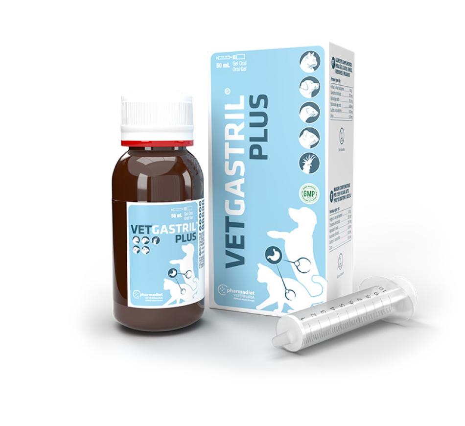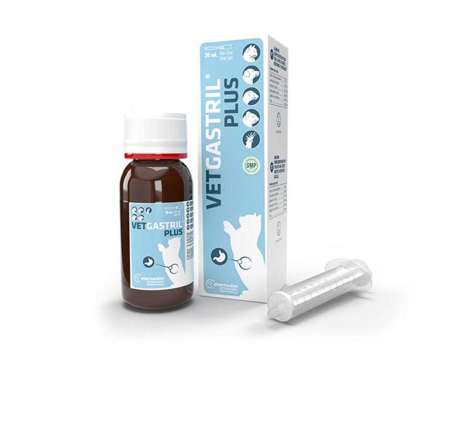 Vetgastril Plus é um suplemento alimentar que ajuda a melhorar a saúde digestiva do seu cão ou gato; este produto produz um gel de consistência viscosa que actua como protector da mucosa gástrica contra o suco gástrico do estômago do seu animal de estimação.